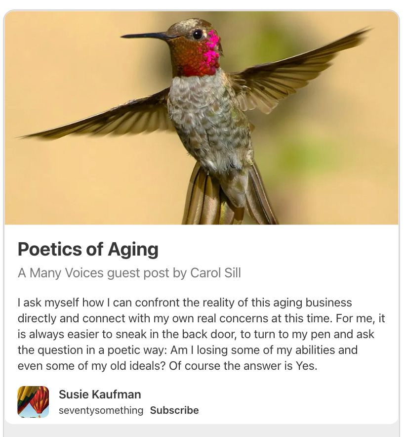 My article Poetics of Aging was featured in Susie Kaufman’s Substack. Click on the hummingbird to read. (And consider subscribing to her work, too.)