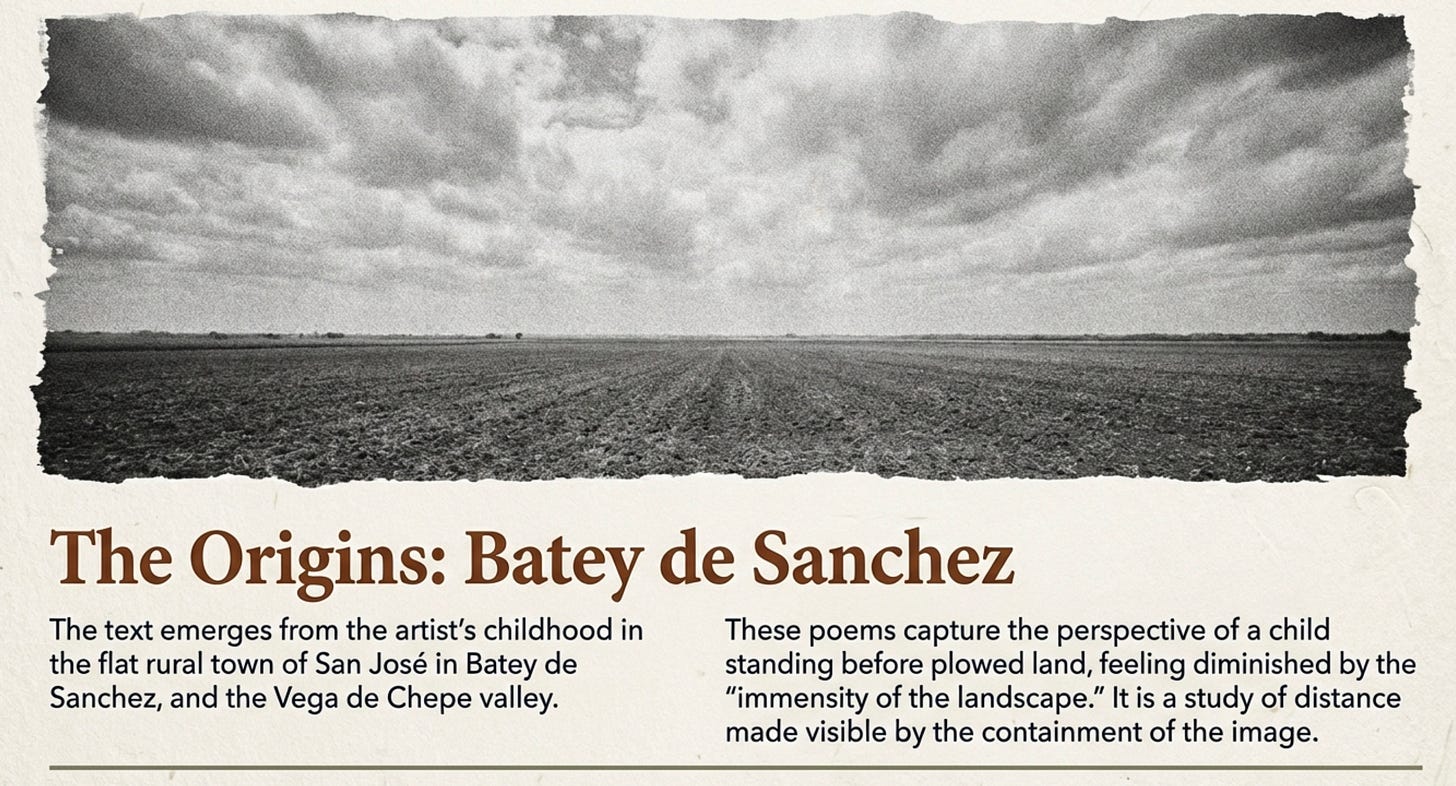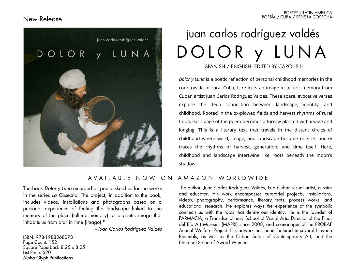 Book description, taken from the introduction: Dolor y Luna is a poetic reflection of personal childhood memories in the countryside of rural Cuba, It reflects an image in telluric memory from Cuban artist Juan Carlos Rodríguez Valdés. These spare, evocative verses explore the deep connection between landscape, identity, and childhood. Rooted in the ox-plowed fields and harvest rhythms of rural Cuba, each page of the poem becomes a furrow planted with image and longing. This is a literary text that travels in the distant circles of childhood where word, image, and landscape become one. Its poetry traces the rhythms of harvest, generation, and time itself. Here, childhood and landscape intertwine like roots beneath the moon’s shadow.